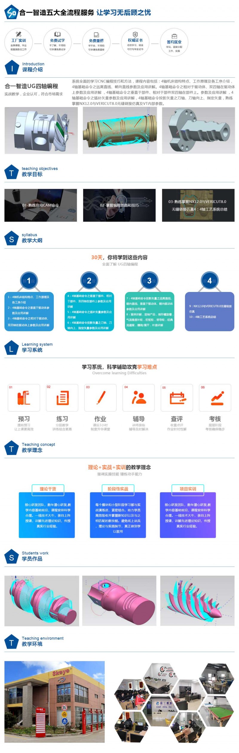 公司主营 CNC数控编程(3-4-5轴)定制培训业务,总结多年线下机加工企业内部培训经验,以NX.MasterCAM、PowerMill、 HyperMill 等软件为主导,以"CNC工艺系统”为特色(机床-刀具- 夹具-工件-CAM软件的组织协调能力),以“线上+线下”培训模式,结合当下主流工艺形式,高度还原实用本质。受到了自动化设备、功能性测试治(FCT/ICT)、 注塑模具、压铸模具、高压电导体、航空结构件加工领域企业的一致好评,真正做到行知合一,助力中国制造2025!