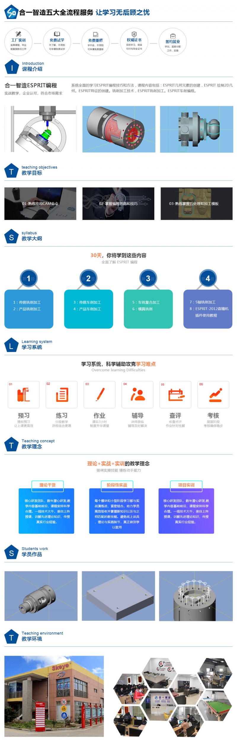 公司主营 CNC数控编程(3-4-5轴)定制培训业务,总结多年线下机加工企业内部培训经验,以NX.MasterCAM、PowerMill、 HyperMill 等软件为主导,以"CNC工艺系统”为特色(机床-刀具- 夹具-工件-CAM软件的组织协调能力),以“线上+线下”培训模式,结合当下主流工艺形式,高度还原实用本质。受到了自动化设备、功能性测试治(FCT/ICT)、 注塑模具、压铸模具、高压电导体、航空结构件加工领域企业的一致好评,真正做到行知合一,助力中国制造2025!