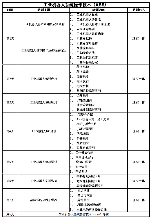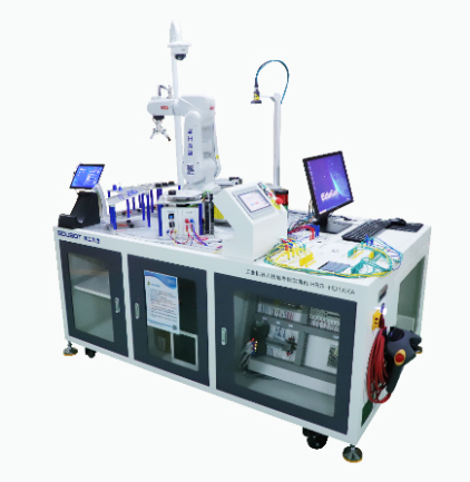 采用HRG-HD1XKA型工业机器人技能考核实训台,其实训台由实训平台、ABB机器人、编程电脑、可编程逻辑控制器(PLC)、工业触摸屏、配套实训模块及气动部件等组成。