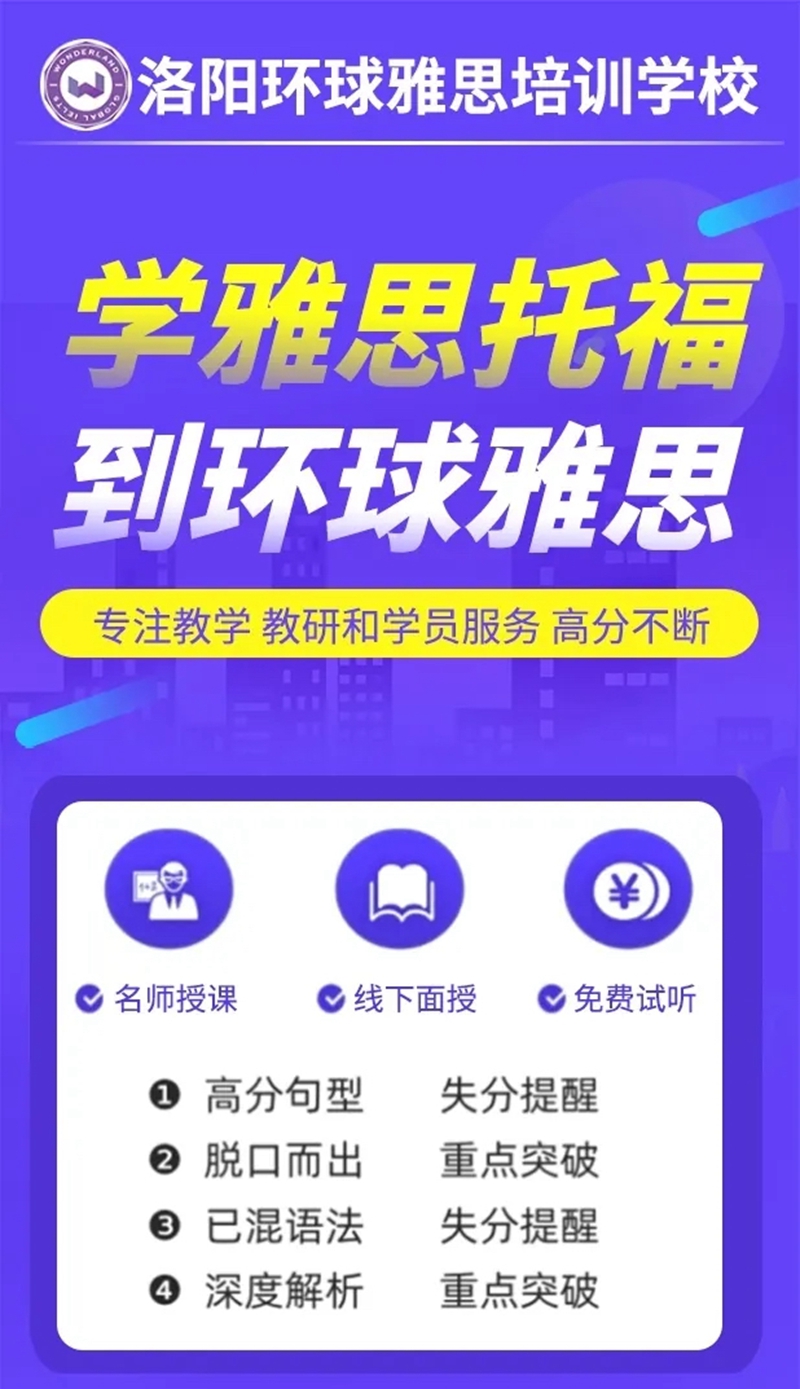 环球教育创立于1997年, 全国近200个城市设立300多家考试和培训中心,专注出国语言培训二十余年,开设有雅思、托福、SAT、GMAT、GRE、A-level、PTE等课程。洛阳校区自2008年入驻以来,秉承“摒弃浮夸,追求专业”的经营理念,始终坚持教学质量为先,以学子为本,以教育为实,精益求精,稳定输出高分学员,成功培育万千学子踏出国门,追逐更高的求学理想!