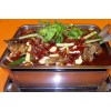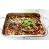万州烤鱼是属于重庆汉族传统名菜,属于渝菜系。万州烤鱼把鱼剖洗净后平放在铁夹中,放在炉上用木炭烧烤,盛到专用铁盘中,浇上用牛油、红油、白糖、花椒、辣椒等调味品炒出底料,放上西芹、豆芽等爽口菜。口味咸辣。万州烤鱼采用“先烤后炖”的独特做法,融合了烤、炖两种烹饪工艺的精华。据说川式烤鱼的由来是从非洲传来的,一名捕到鱼的非洲土著,烤了很久鱼还未熟,便把那条鱼加入汤汁调味料边吃烤,发现比以往任何时候都鲜美,从此就有了这道美味,烤鱼相传已有千余年历史。